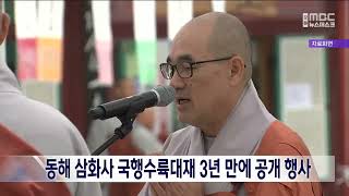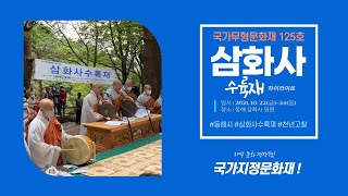 삼화사수륙재 설행 개요삼화사수륙재는 100일전 왕실에서 수륙재에 필요한 물목 중 중요한 향을 내리는 행향사(영향축의)를 시작으로 2박 3일간의 회향의식으로 진행되었다. 현재에는 수륙재 설행 49일 전에 77재 입재를 하여 7일마다 재를 지내고, 그 중 30일 전에 행향사 의식을 거행한다. 회향은 10월 셋째주 금요일에서 일요일까지 2박 3일에 걸쳐 설행된다. 2022년에는 코로나19로 2019년부터 공개하지 않았던 의식을 3년만에 공개하여 10월 14일부터 16일까지 거행하였다. 30일전 행향사 첫째 날(10.18) : 신중작법, 괘불불패이운, ... -