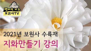진관사수륙재 종이로 만든 기물종이로 만든 기물은 지화, 지의와 넋전, 금은전과 주망공사 등이 있으며 대부분 봉송회향 때 태우게 된다. 진관사 수륙재에서는 연꽃·작약·살모란 등을 만들어 다양한 꽃꽂이로 의례공간을 수놓게 된다. 지화는 수량이 많고 만드는 과정이 복잡하여, 초파일 직후부터 입재 무렵인 8월까지 제작한다. 지화 제작은 전문 장인 이기원의 지도로 사찰의 스님과 신도들이 전통 지화 제작 기법에 따라 만든다. 그 과정은 한지를 필요한 크기에 따라 재단, 전통 방식으로 물을 들이는 염색, 주름을 펴는 발다듬이질, 꽃·잎·꽃받침을 만드는 모양내기, ...