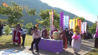 진관사수륙재 낮재 시련 의식 (2)시련은 모실 ‘시(侍)’, 손수레·가마 ‘연(輦)’에서 비롯된 명칭으로 옹호성중을 비롯하여 재장에 초청하는 일체 대상을 모셔 오는 절차이다. 국행수륙재의 전통을 이어가는 진관사에서는 국왕의 영령을 모셔 오는 연과 설판재자의 영가를 위한 연으로 구성된다. 연 안쪽 방석 위에는 영가가 평소 입었던 옷 보따리가 올려져 있다. 악사와 취타대가 불단 앞으로 나와 의식의 시작을 알리는 타주를 마치면 어산단이 옹호게(擁護偈)를 노래하면서 의례가 시작된다. 수륙재의 첫 곡으로 부르는 옹호게는 시련뿐 아니라 신중작법, 괘불이운 등 여러 재... -