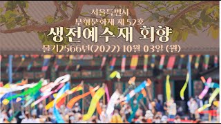 청련사예수재 작법작법무의 종류는 일반적으로 바라무, 착복무, 법고무로 나눌 수 있다. 청련사 생전예수재에서도 이 세 가지의 범무(梵舞)가 작법된다. 바라무는 바라를 들고 빠르고 강렬하게 움직이는 춤으로 성현을 옹호하고 도량을 정화하려는 목적으로 설행된다. 착복무는 육수가사에 고깔을 쓰고 양손에 연꽃을 든 상태로 느리고 고요하게 작법한다. 마음의 청정함을 이끌어 삼매에 이르도록 돕는 춤이다. 법고무는 법고를 치면서 이루어지는 무용으로 주로 단독으로 설행된다. 느리게 시작하여 점차 빠르고 격렬하게 진행되며 끝으로 가면서 다시 느려진다. 수행과 중... -