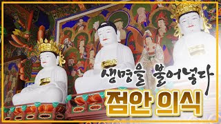 점안의식 절차 소개〈그림 1〉감로암 부처님 점안의식(송광사) 점안의식(點眼儀式)은 새로 조성된 불상에 부처로서의 격이 갖추어지게 하여 신앙의 대상이 되도록 하는 의식을 일컫는다. 점안의식은 『동국이상국집(東國李相國集)』이나 『동문선(東文選)』에 실린 여러 글에서 알 수 있듯이 고려시대에 주요한 의례로 확립되어 설행되고 있었으나, 자료의 한계로 인해 상세한 절차와 상징적 의미를 알기는 어렵다. 현재 설행되는 점안의식은 조선시대에 성립된 『조상경』을 비롯한 의궤류에 근거한다. 점안의식의 대상에는 불보살상 외에 나한(羅漢), 신중(神衆), 천왕(天王...
