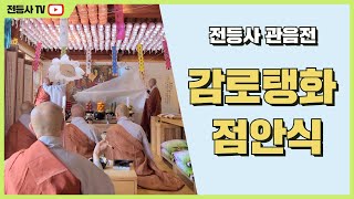③ 할등(喝燈): 등(燈)은 무명을 꿰뚫어 보는 깊은 지혜인 반야를 상징한다. 그러므로 등을 밝힌다는 것은 부처님의 깨달음이 역대 조사들을 통해 현재까지 이어지고 있음을 상징하는 것이며, 본 의식은 그것을 찬탄하는 것이다.