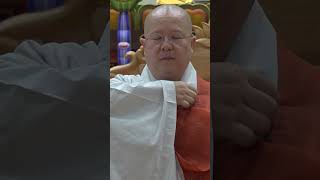 착의법가사를 착용하는 순서는 크게 ‘예경과 준비-가사를 어깨에 올리기-가사를 펼치기-소매·고리 정리하기-마무리하기’로 나눌 수 있다. 1. 예경과 준비 가사를 가사걸이에서 내리고 반배(半拜) 후 정대게(正大偈)로 마음가짐을 정돈하는 단계이다. (1) 가사걸이 앞에서 합장 반배한 다음 왼발을 일 보 내디디며 왼손으로 가사를 당긴다. (2) 오른손으로 팔 위쪽 단을 잡은 후 2분의 1을 접고 다시 2분의 1을 접는다. (3) 가사를 양손으로 받쳐 들고 몇 발짝 뒤로 물러나 두 손으로 가사를 정대하고 정대게를 구송한다. 2. 어깨에 올리... -